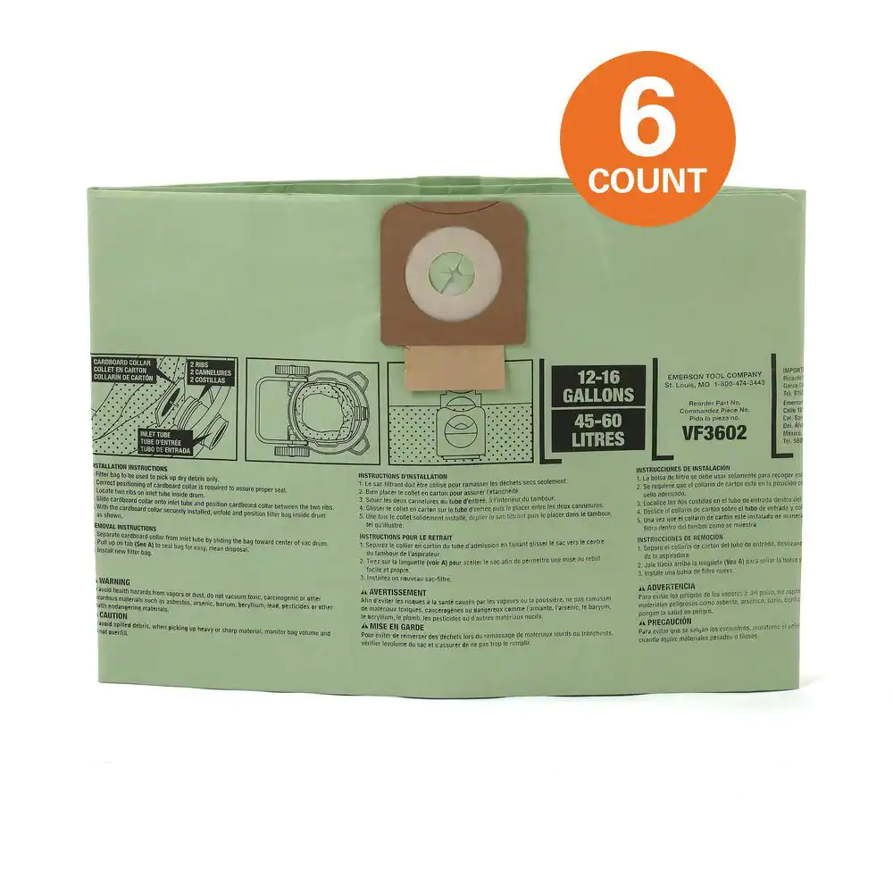 RIDGID Wet/Dry Vac Premium Cyclonic Dry Pick-up Only Dust Bags for Select 12 to 16 Gallon RIDGID Shop Vacuums, Size A (6-Pack)
