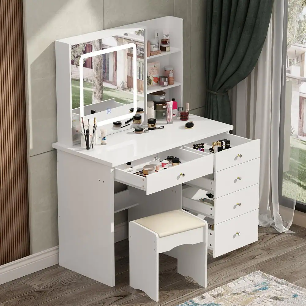 FUFU&GAGA 5-Drawers White Makeup Vanity Sets Dressing Table Sets with LED Dimmable Mirror, Stool and 3-Tier Storage Shelves