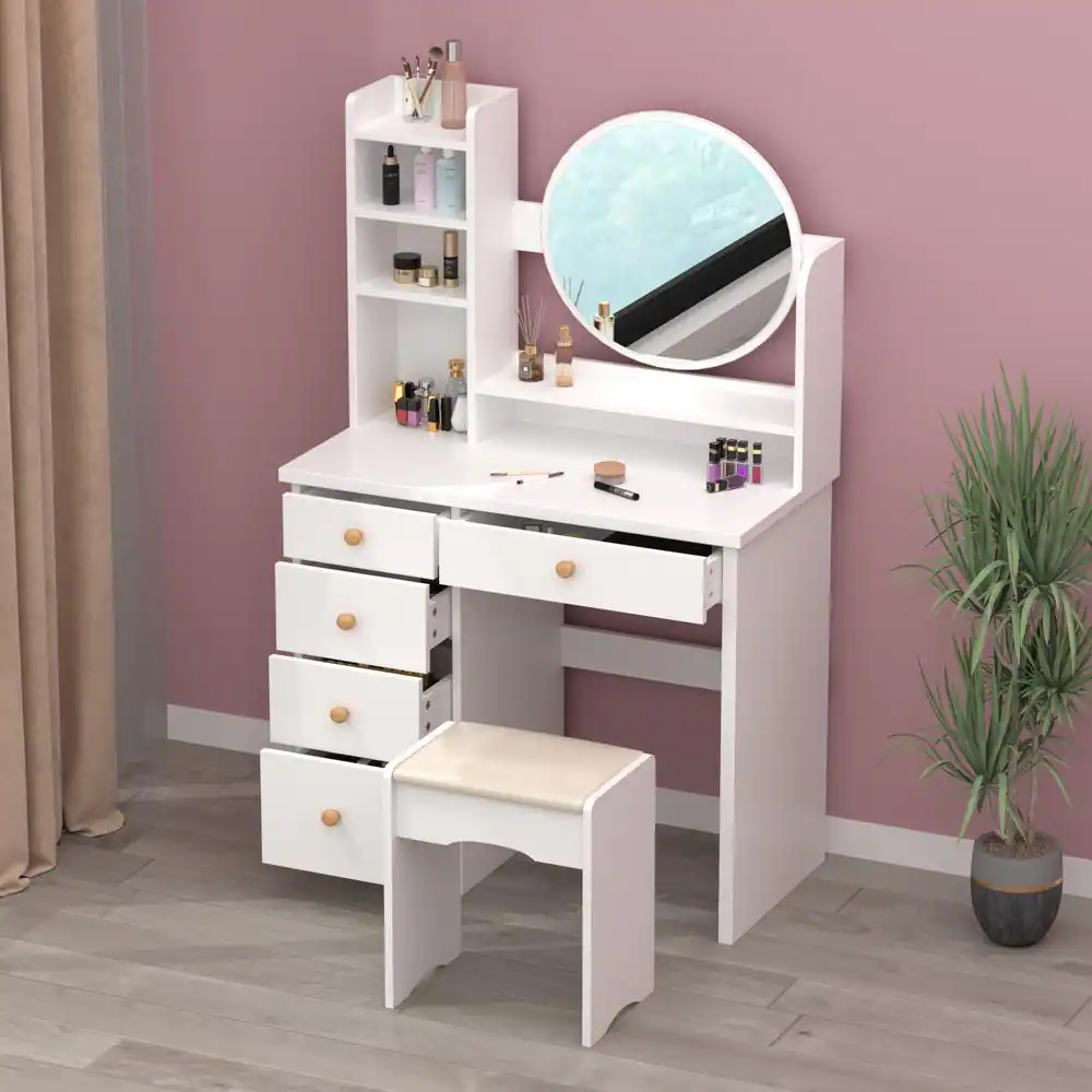 WIAWG 5-Drawers White Makeup Vanity Table Set with Stool Dressing Desk Vanity Wood with Round Mirror Storage Shelves