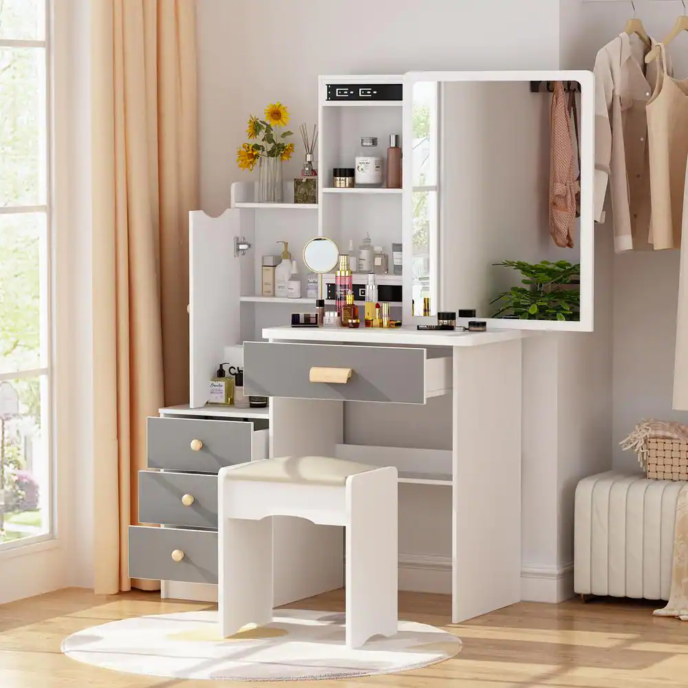 FUFU&GAGA 4-Drawers Gray Wood Makeup Vanity Table Stool Set Rectangle Mirror with Storage Shelves