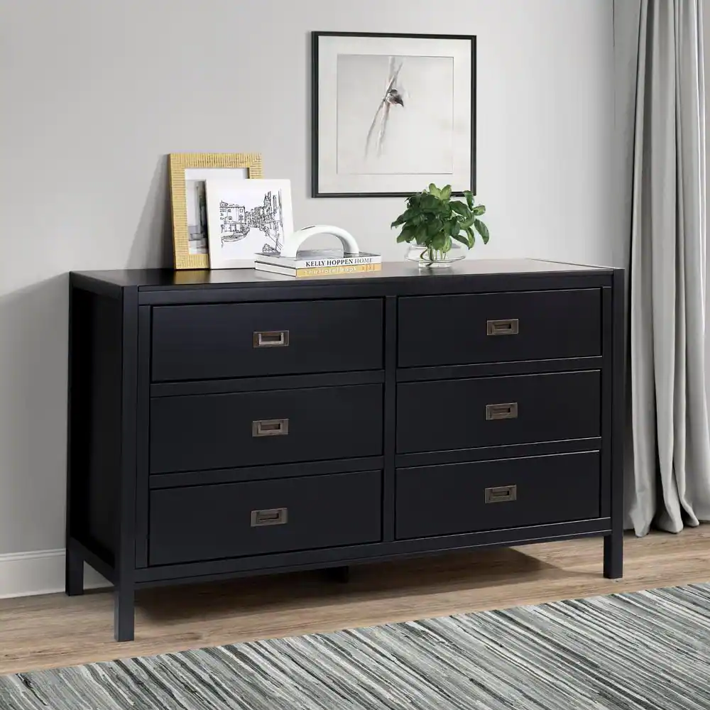 Welwick Designs 6-Drawer Black Solid Wood Mid-Century Modern Gallery-Top Dresser (33.75 in. H x 55.25 in. x 16 in. D)