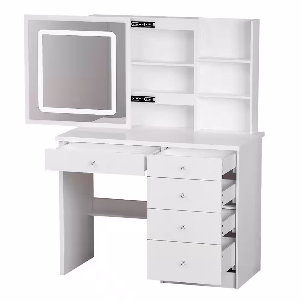 None Wood LED Push-Pull Mirror Dresser with 5-Drawers, Stool and 3-Tier Storage Shelves(53.5 H x 39.4 W x 19.7 D in.)