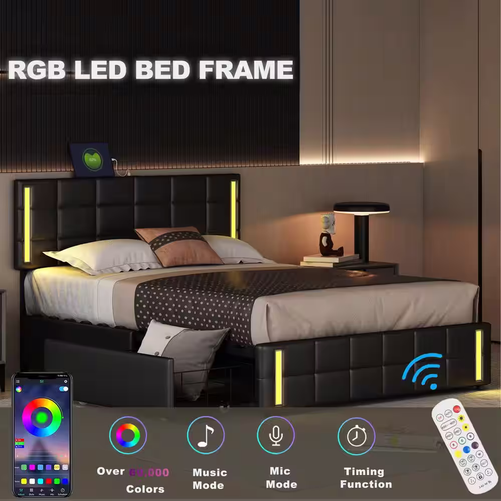 Harper & Bright Designs Black Wood Frame Queen Size Faux Leather Platform Bed with Adjustable Headboard, LED Lights, USB Chargers and 4 Drawers