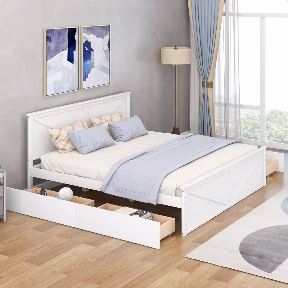 Harper & Bright Designs White Wood Frame King Size Platform Bed with 4 Storage Drawers