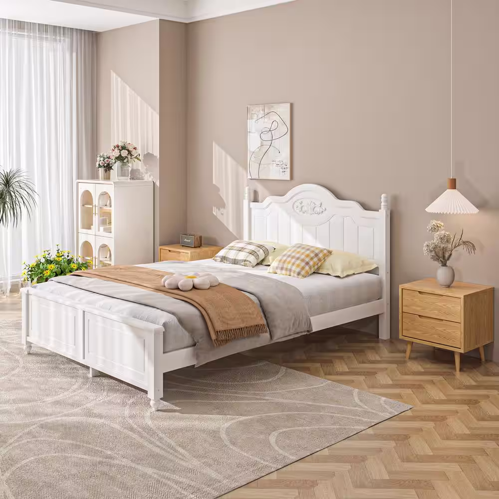 None White Solid Pine Frame Queen Size Bed Platform Bed With Headboard