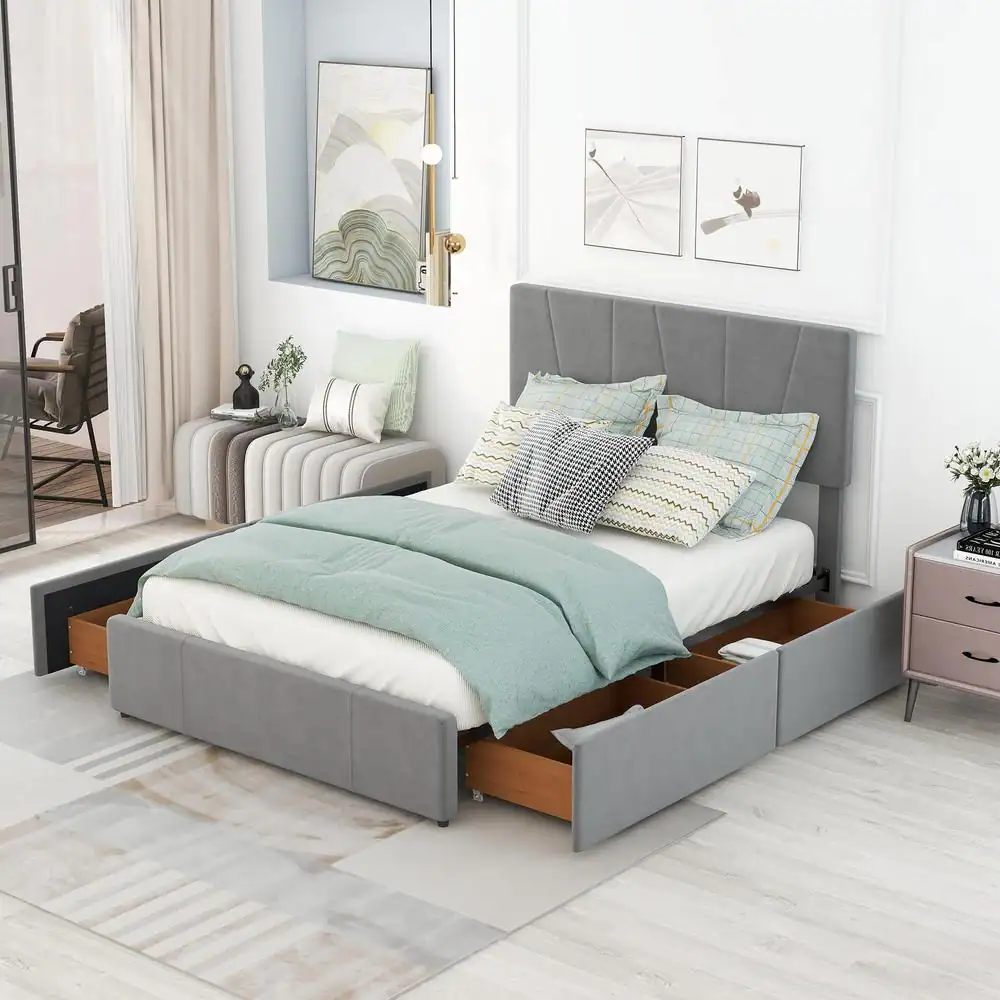Harper & Bright Designs Gray Upholstery Wood Frame Full Size Platform Bed with 4 Drawers and Adjustable Headboard