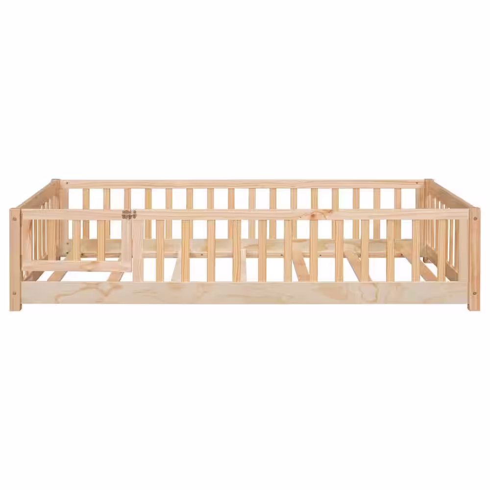 wetiny Beige Wood Frame Twin Platform Bed with Fence and Door