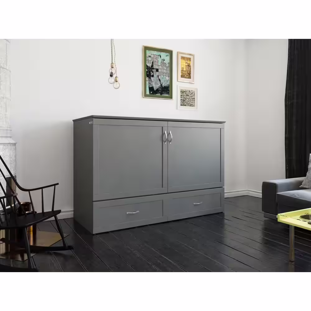 AFI Raleigh Queen Grey Wood Murphy Bed Chest with Mattress, Storage & Built-in Charging