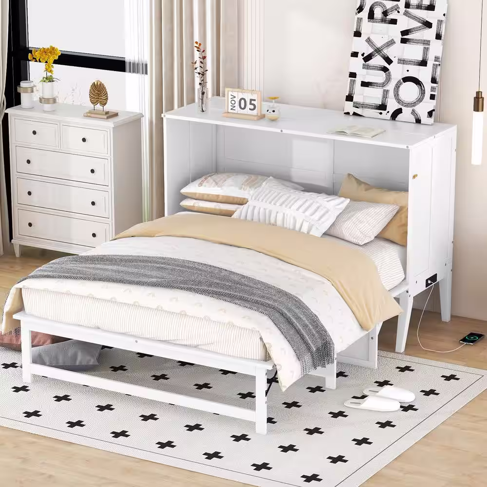 Harper & Bright Designs White Wood Frame Queen Size Murphy Bed with Built-in Charging Station, Cabinet with Desktop