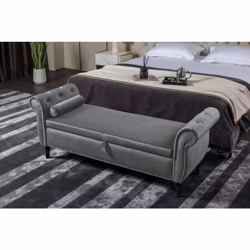 None Gray Velvet Upholstered Ottoman 63 in. Bedroom Bench Tufted Storage Bench with Solid Wood Legs