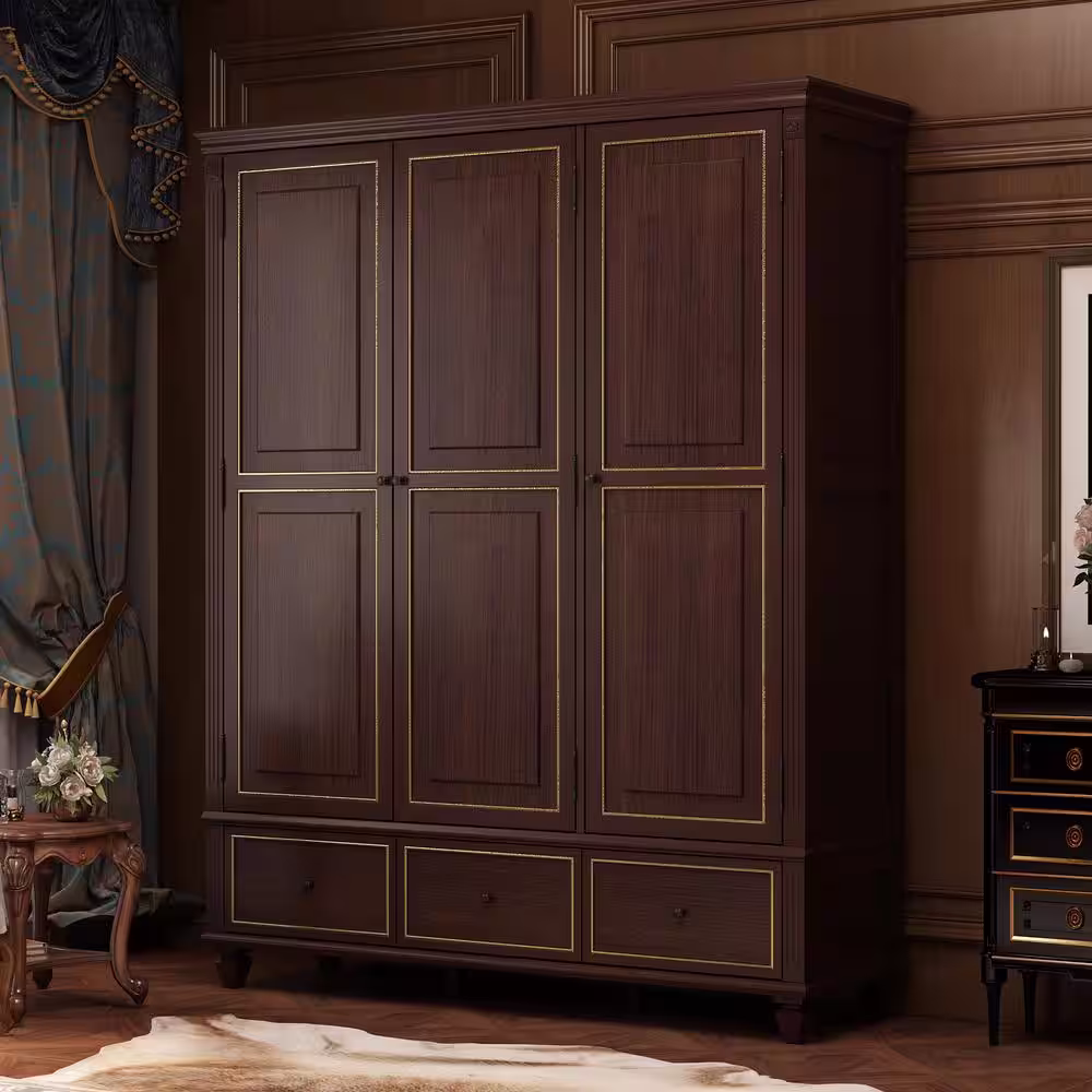 None Brown 3-Door Big Wardrobe Armoires with Hanging Rod 3-Drawers Storage Shelves (78.7 in. H x 63 in. W x 18.9 in. D)