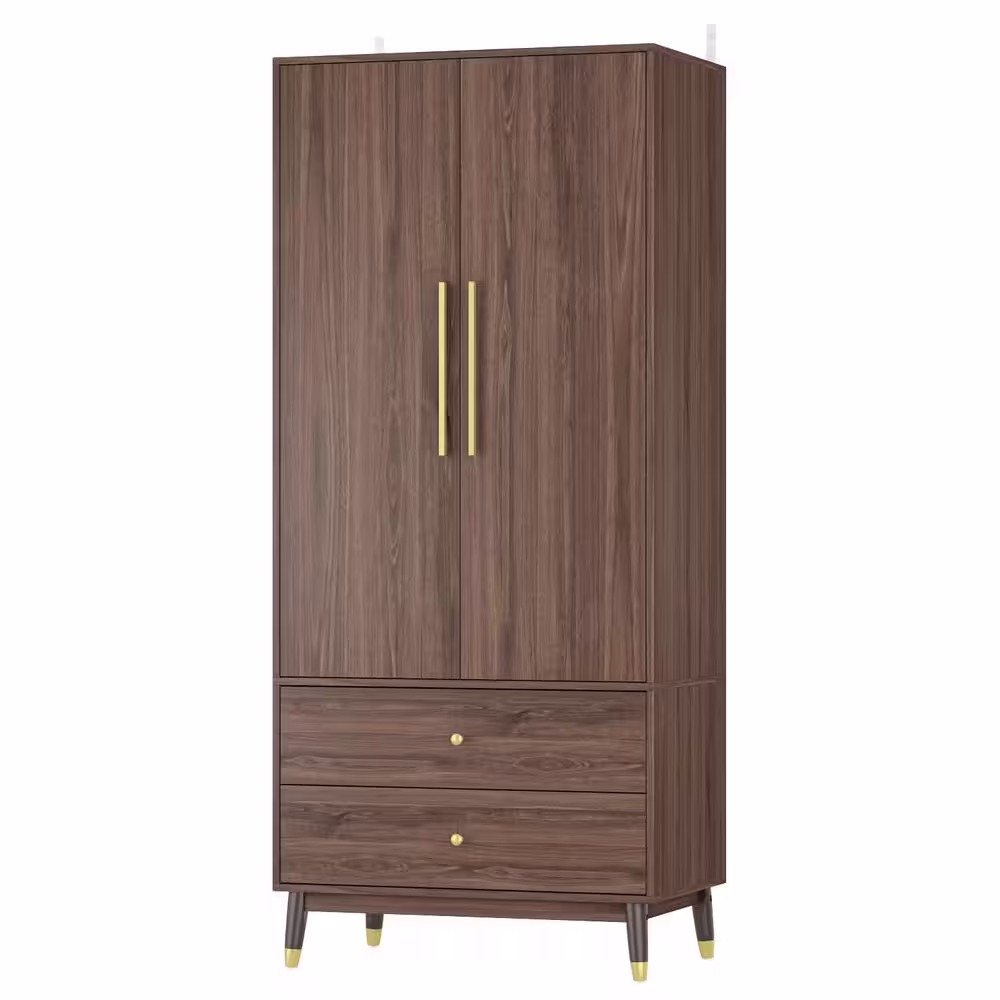 None Brown Armoire with 2-Drawers, Hanging Rod and Gold Metal Handles (71.1 in. H x 19.1 in. W x 31.5 in. D)