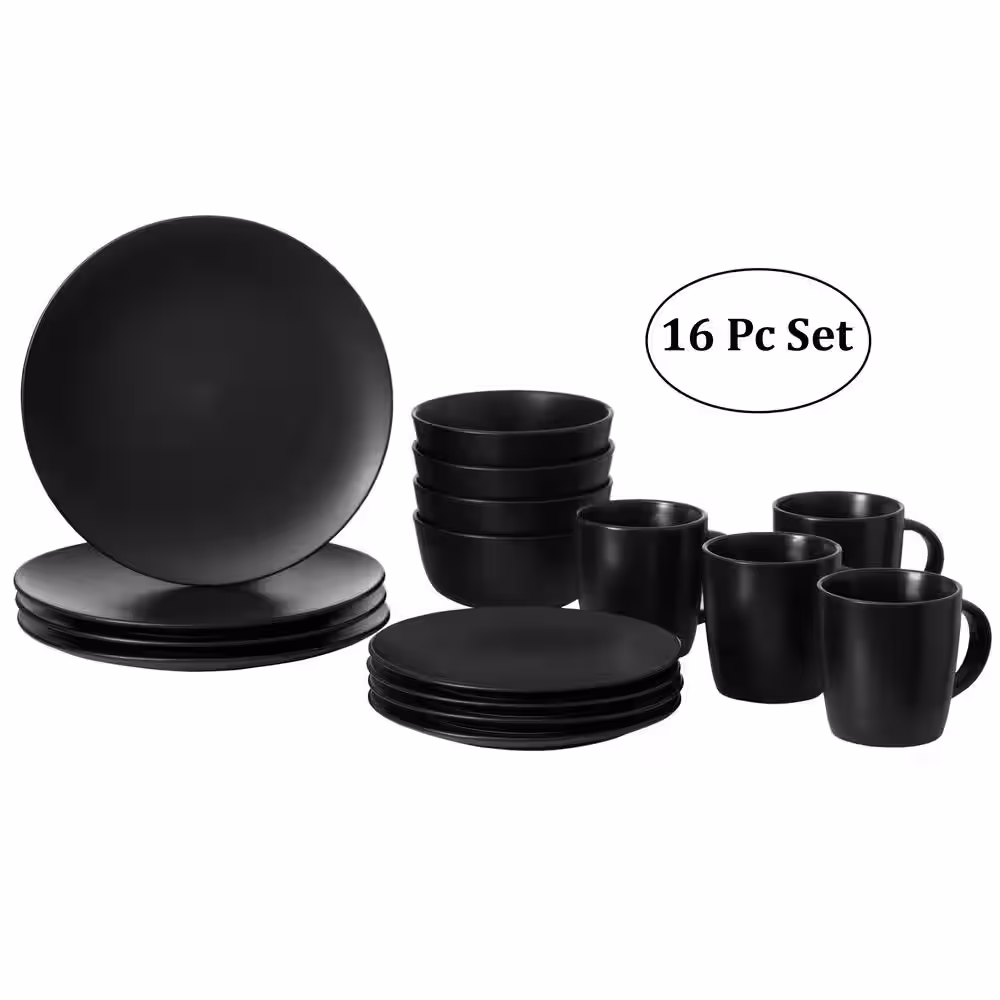 Quickway Imports 16-Piece Matte Black Dinnerware Dish Set for 4 Person Mugs, Salad and Dinner Plates and Bowls Sets, High Quality Dishes
