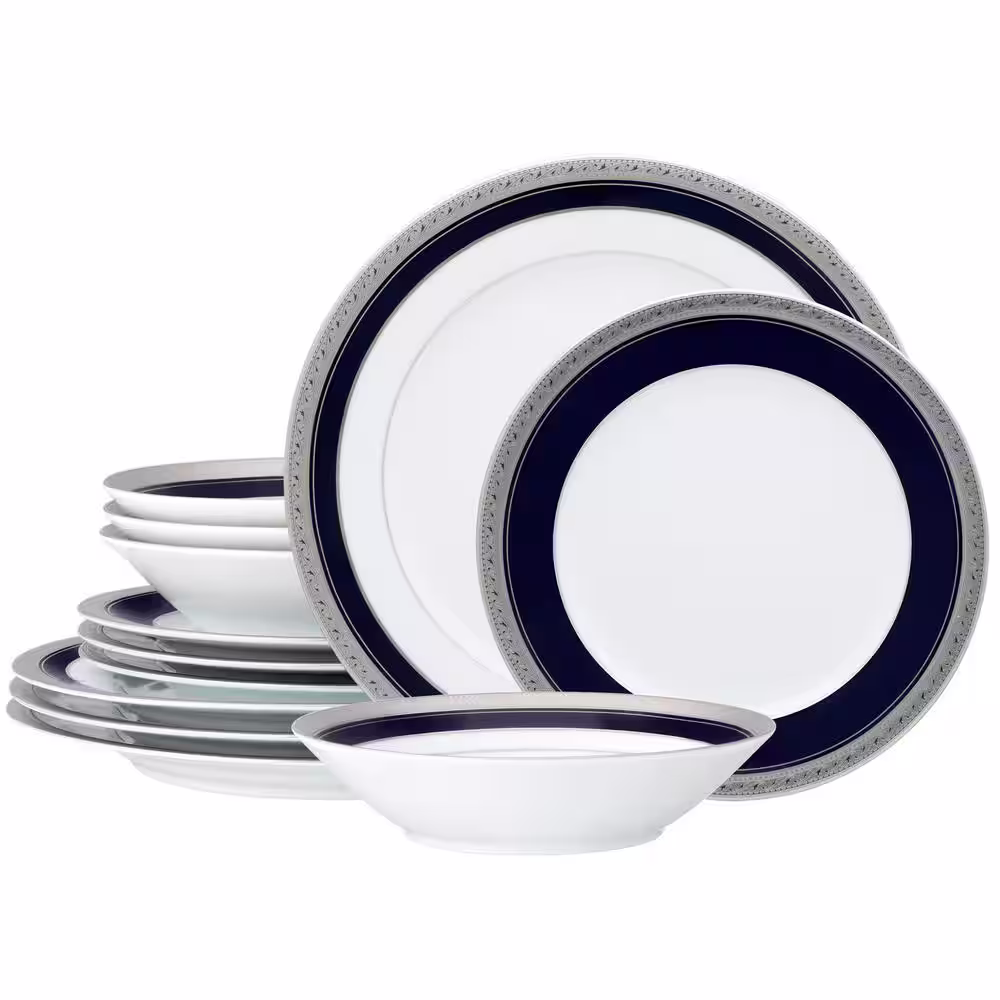 Noritake Crestwood Cobalt Platinum White Porcelain 12-Piece Dinnerware Set, Service For 4