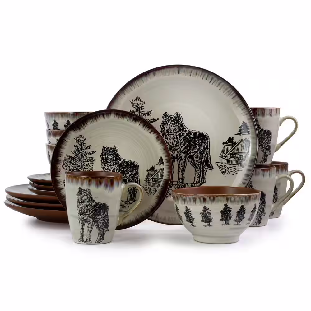 Elama Majestic Wolf 16-Piece Holiday Taupe Stoneware Dinnerware Set (Service for 4)
