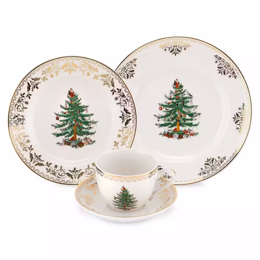 Spode Christmas Tree Four Piece White and Gold Ceramic Dinnerware Set (Service for 1)