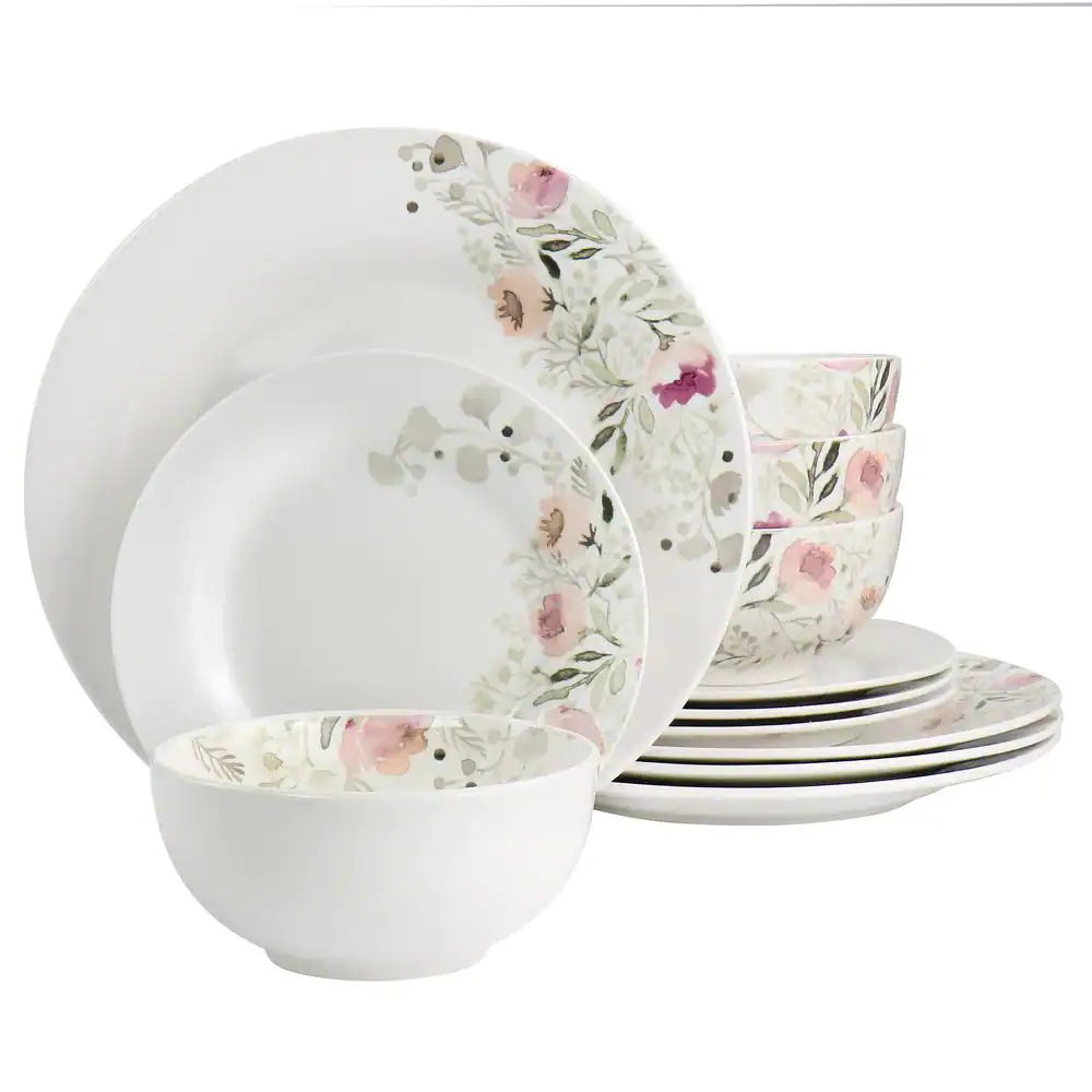 GIBSON HOME Lily Garden Ceramic 12-Piece White and Pink Dinnerware Set