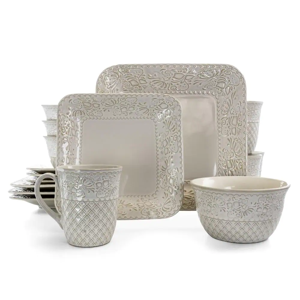 Elama Countess 16-Piece Embossed Double Bowl Stoneware Dinnerware Set in Ivory (Service for 4)