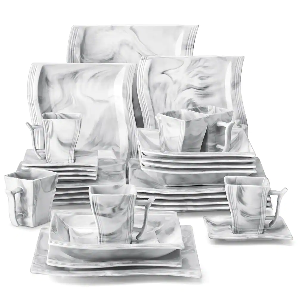 MALACASA Flora 30-Piece Marble Gray Porcelain Dinnerware Set with Dinner Plates, Cup and Saucer Set (Service for 6)