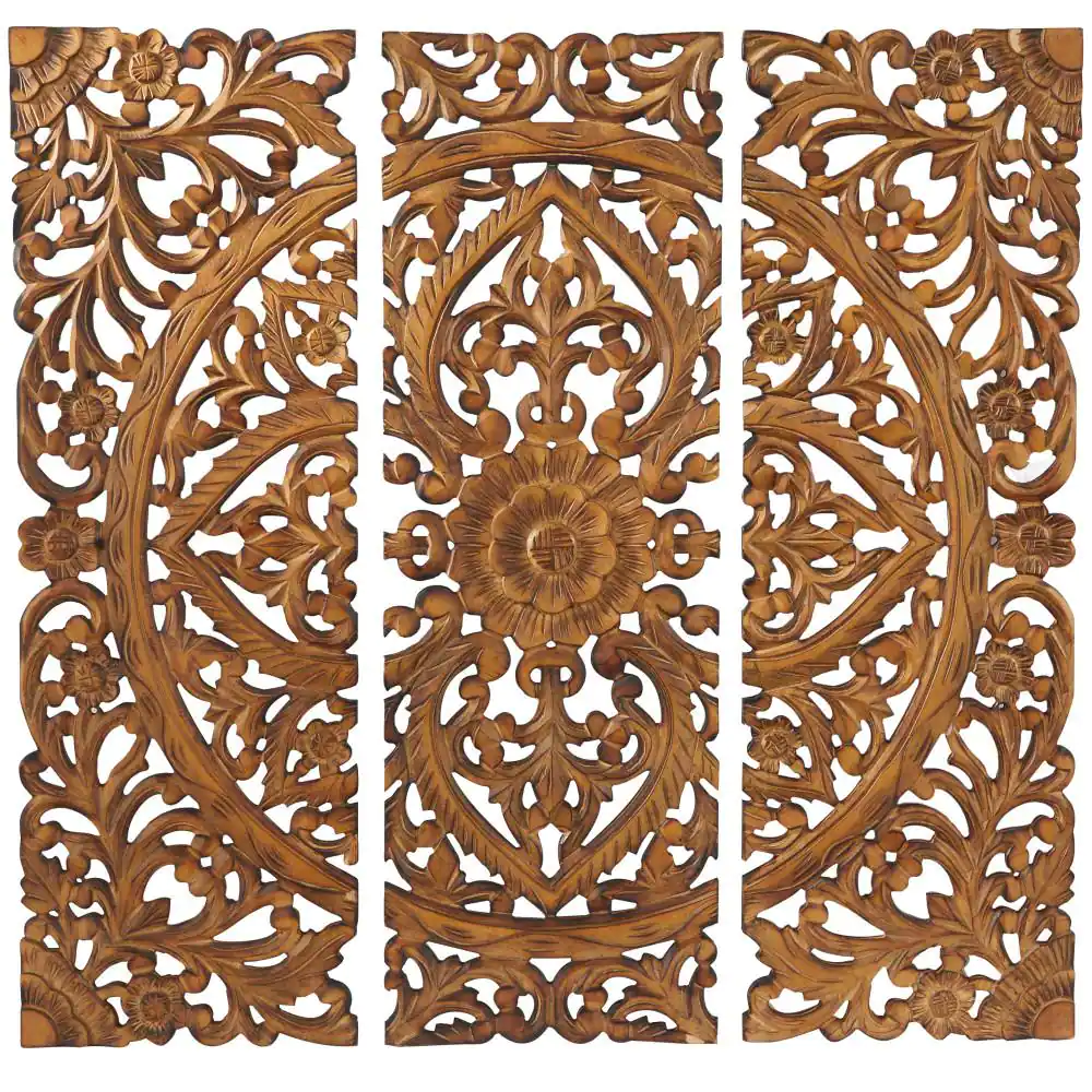 Litton Lane Wood Brown Handmade Intricately Carved Floral Wall Decor with Mandala Design (Set of 3)