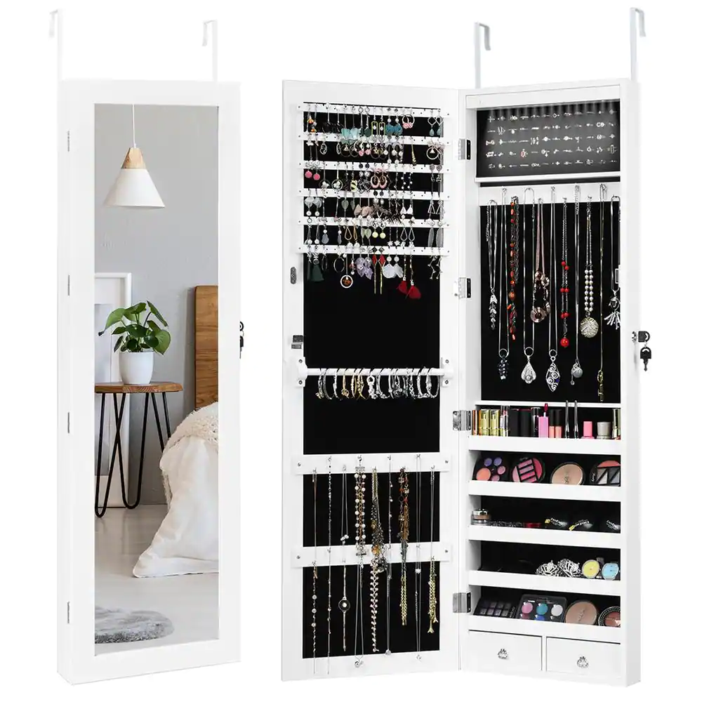 Costway Wall Door Mounted Mirror Jewelry Box Cabinet Lockable Armoire Organizer with LED Light