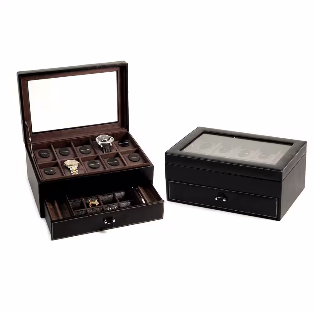 BEY-BERK Black Pebbled Leather 10-Watch Case with Glass See-Thru Top and Drawer for Cufflinks and Pens