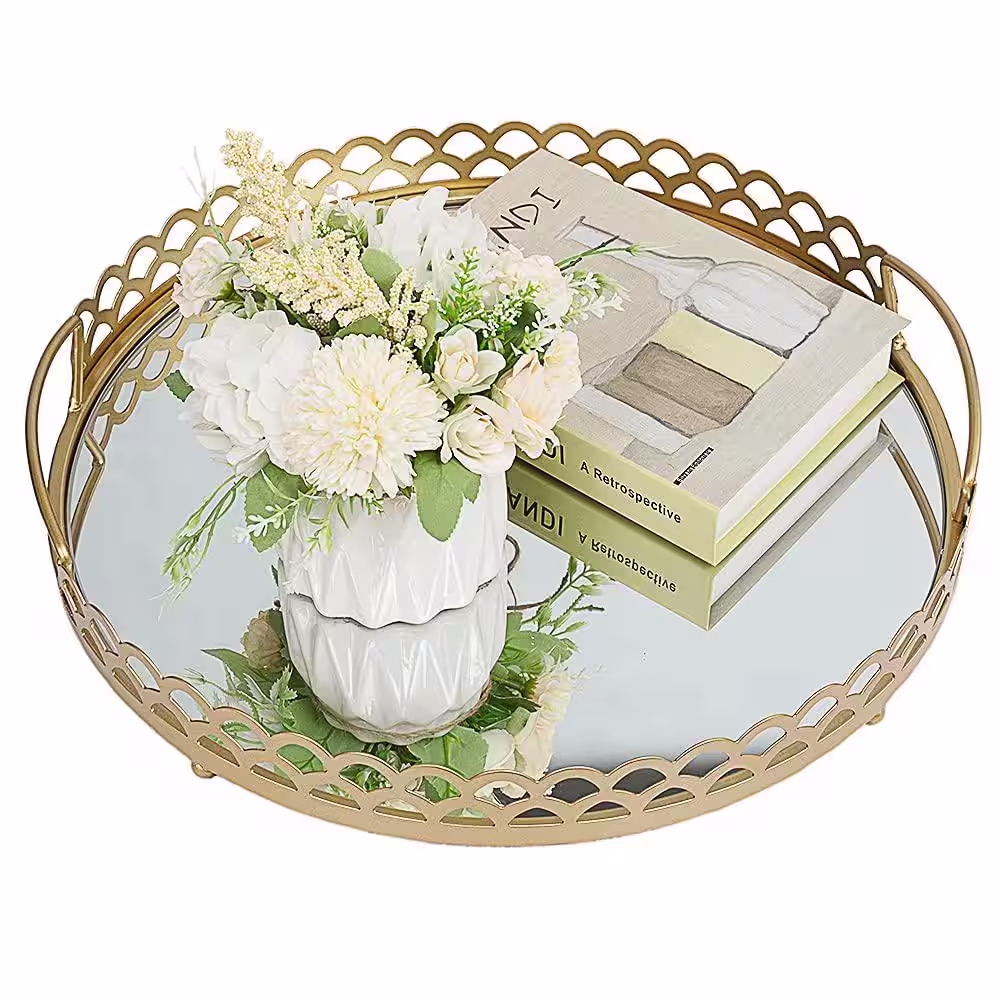 None Gold Mirror Decorative Tray, Large Vanity Tray with Handle, Metal Round Glass Tray for Bathroom, Dresser, Storage