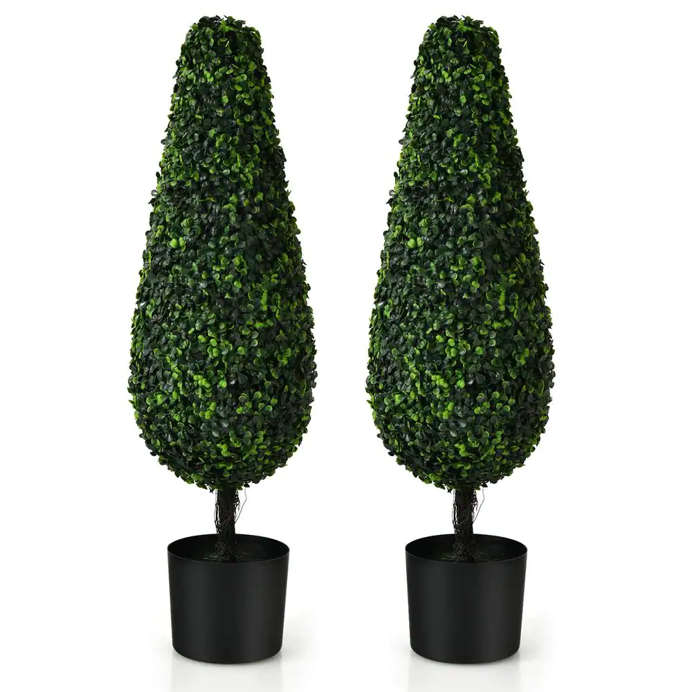 None 35 in. Green Artificial Boxwood Tower Topiary Tree in Pot UV Resistant Indoor Outdoor (2-Pack)