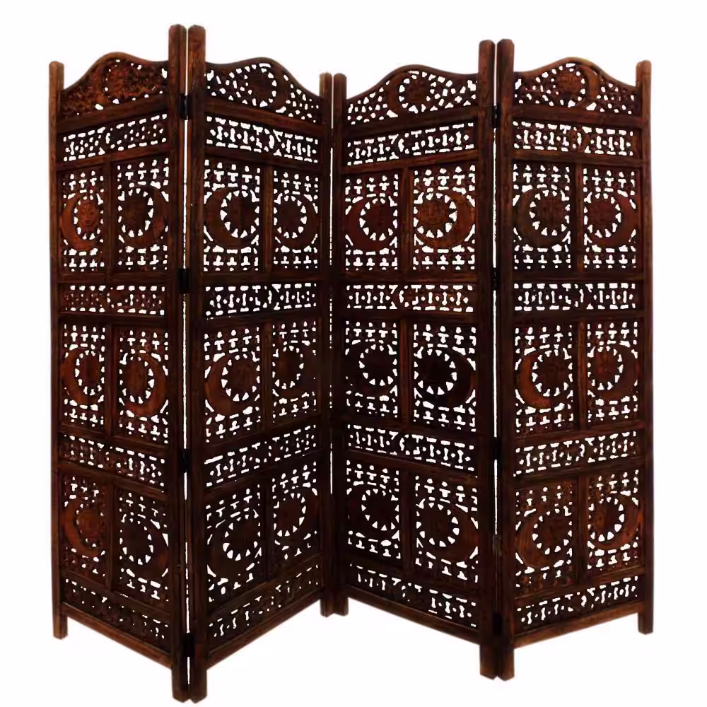 Benzara 71 in. Brown Sun and Moon Design Foldable 4-Panel Wooden Room Divider