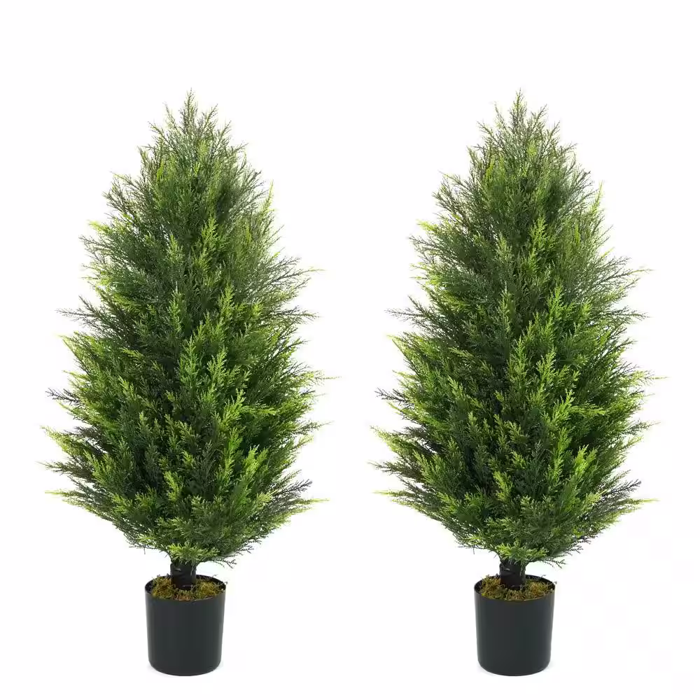 None 3 ft. Green Artificial Cedar Tree, Natural Faux Plants for Outside Planter with Dried Moss, UV Resistant, (Set of 2)