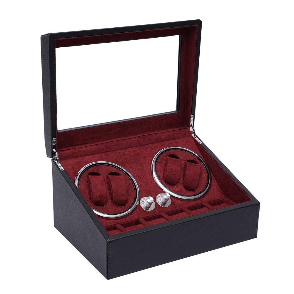 None PU Watch Winder for 4 Automatic Watches with Extra 6 Watch Storages LED Illumination Silent Motor