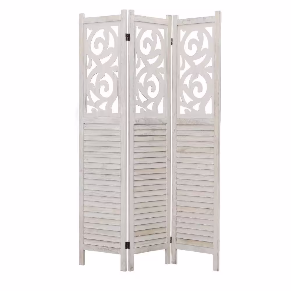 THE URBAN PORT 67 In. Washed White 3 Panels Paulownia Wood Divider Screen with Ornate Scrolled Shutter Design