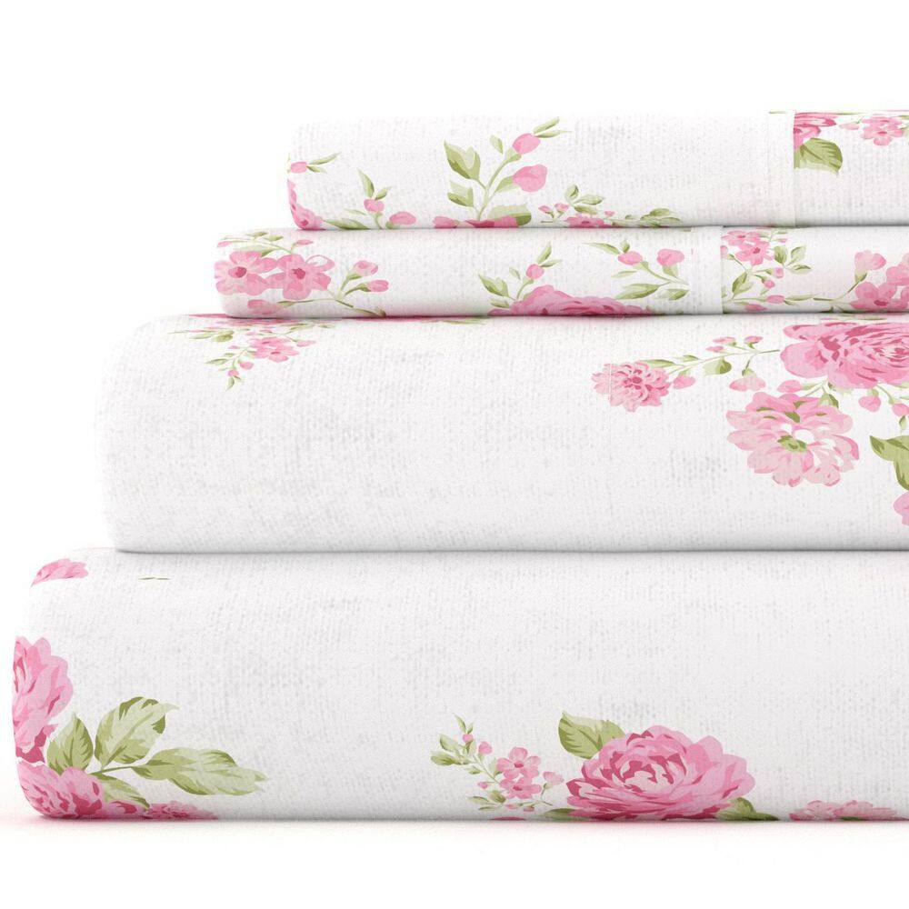 Becky Cameron Premium 4 Piece Pink Rose Bunch Flannel Full Sheet Set