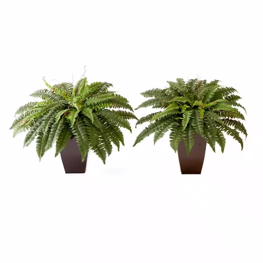 Nearly Natural 23 in. Artificial Green Boston Fern Plant with Tapered Bronze Square Metal Planter DIY KIT (Set of 2)