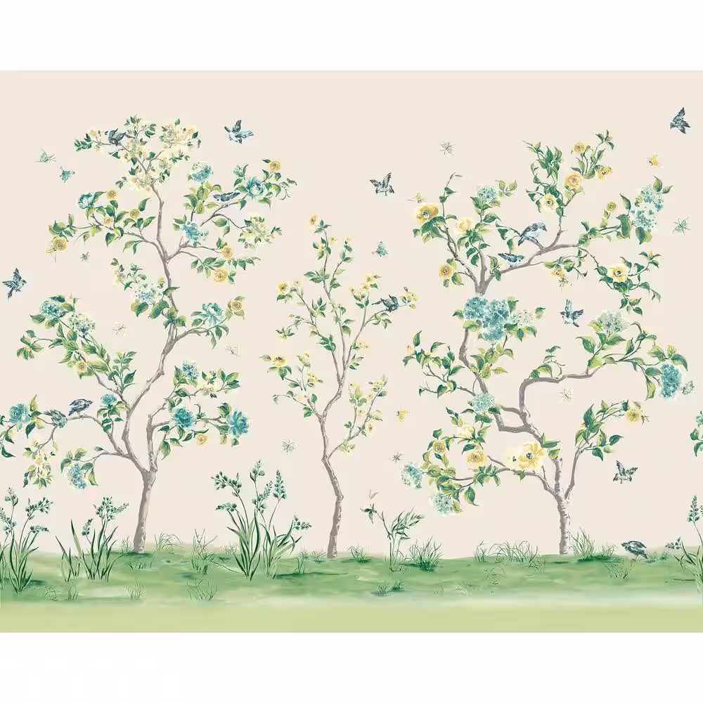 None Green Chinoiserie Flowers Tree Wall Mural