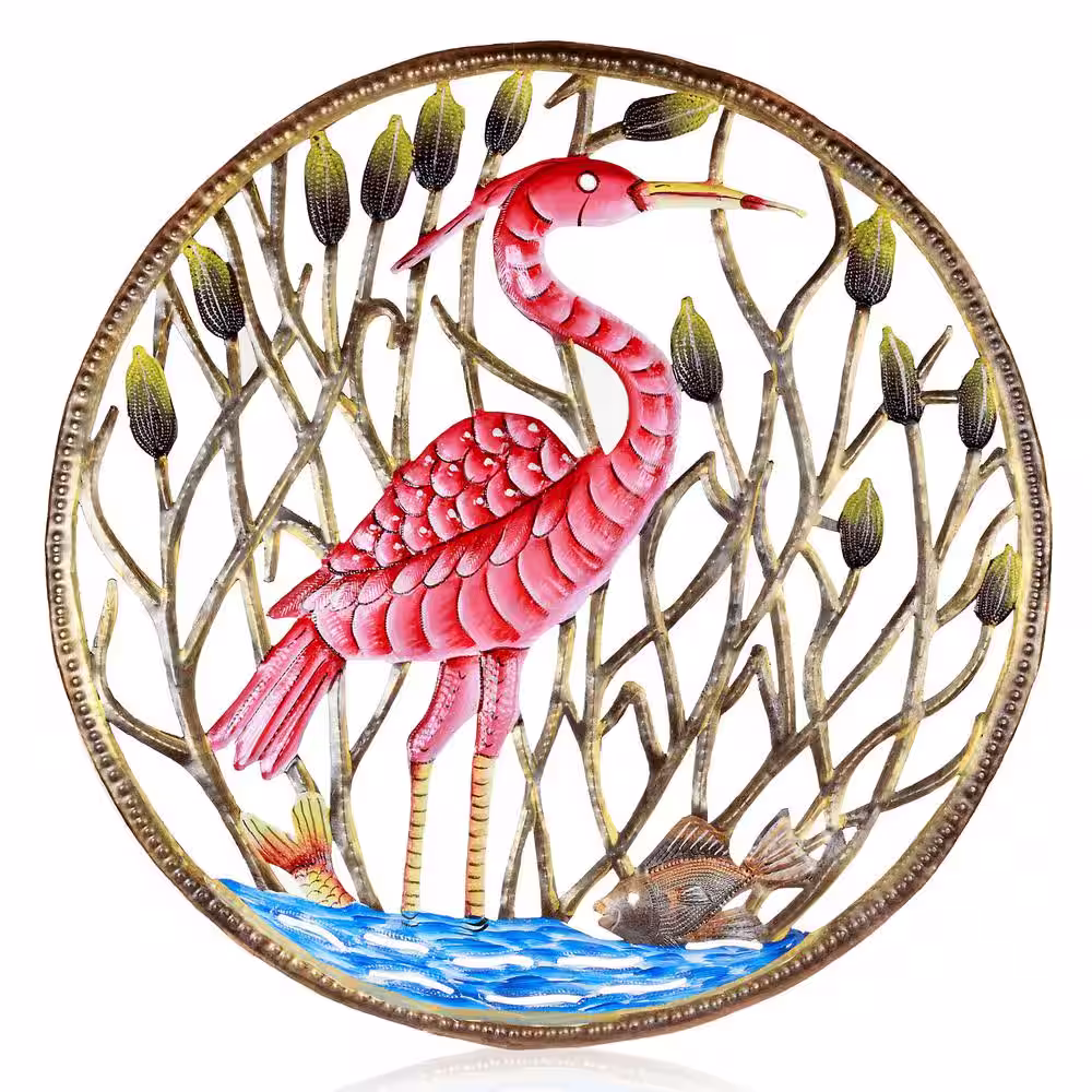None Flamingo in Reeds Haitian Steel Drum Wall Art