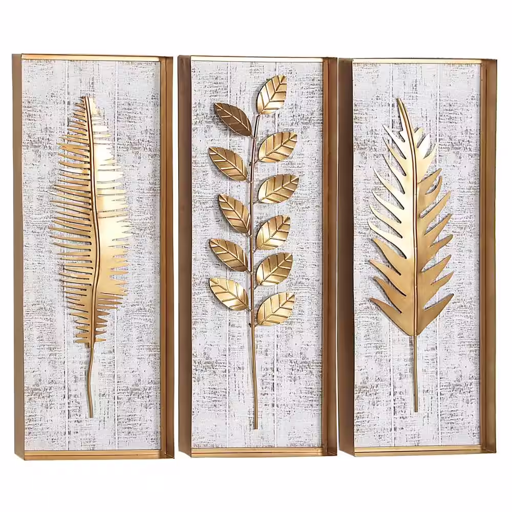 Litton Lane Metal Gold Framed 3D Leaf Wall Decor with Distressed Wood Backing (Set of 3)