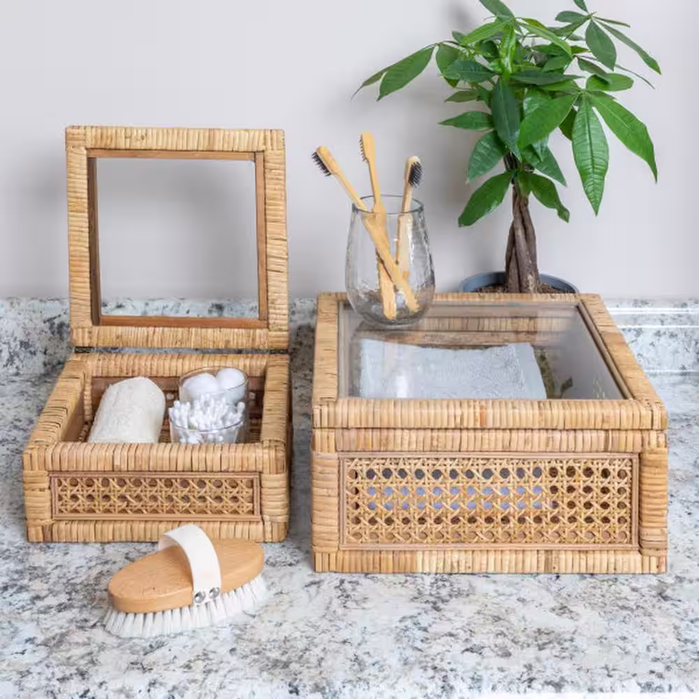 Storied Home Boho Woven Cane and Rattan Display Boxes with Glass Lids in Natural (Set of 2)