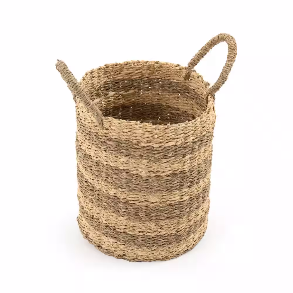 Zentique Cylindrical Handmade Woven Wicker Seagrass Palm Leaf Wire Small Basket with Stripes and Handles