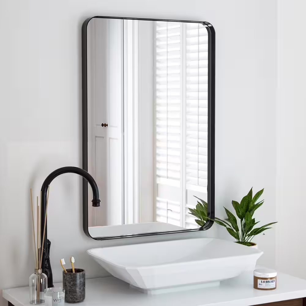 XRAMFY 24 in. W x 36 in. H Rectangular Modern Aluminum Framed Rounded Black Wall Mirror
