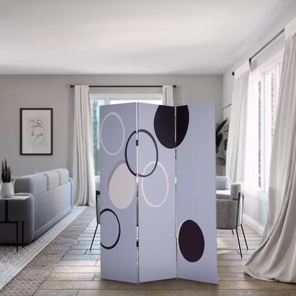 Benjara Black and Gray 3-Panel Room Divider with Overlapping Circles Pattern