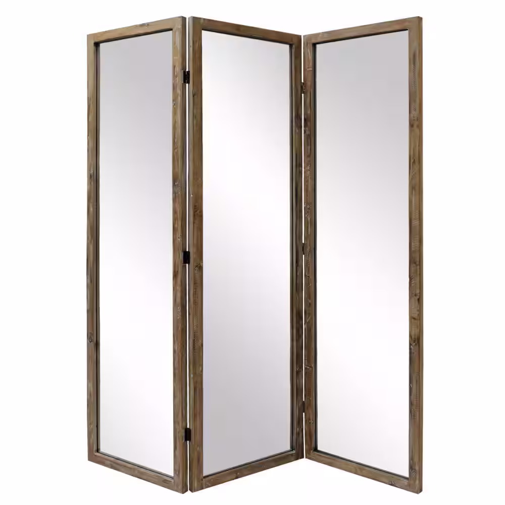 Benjara 70 in. Distressed Brown 3-Panel Mirror Room Divider with Wood Frame