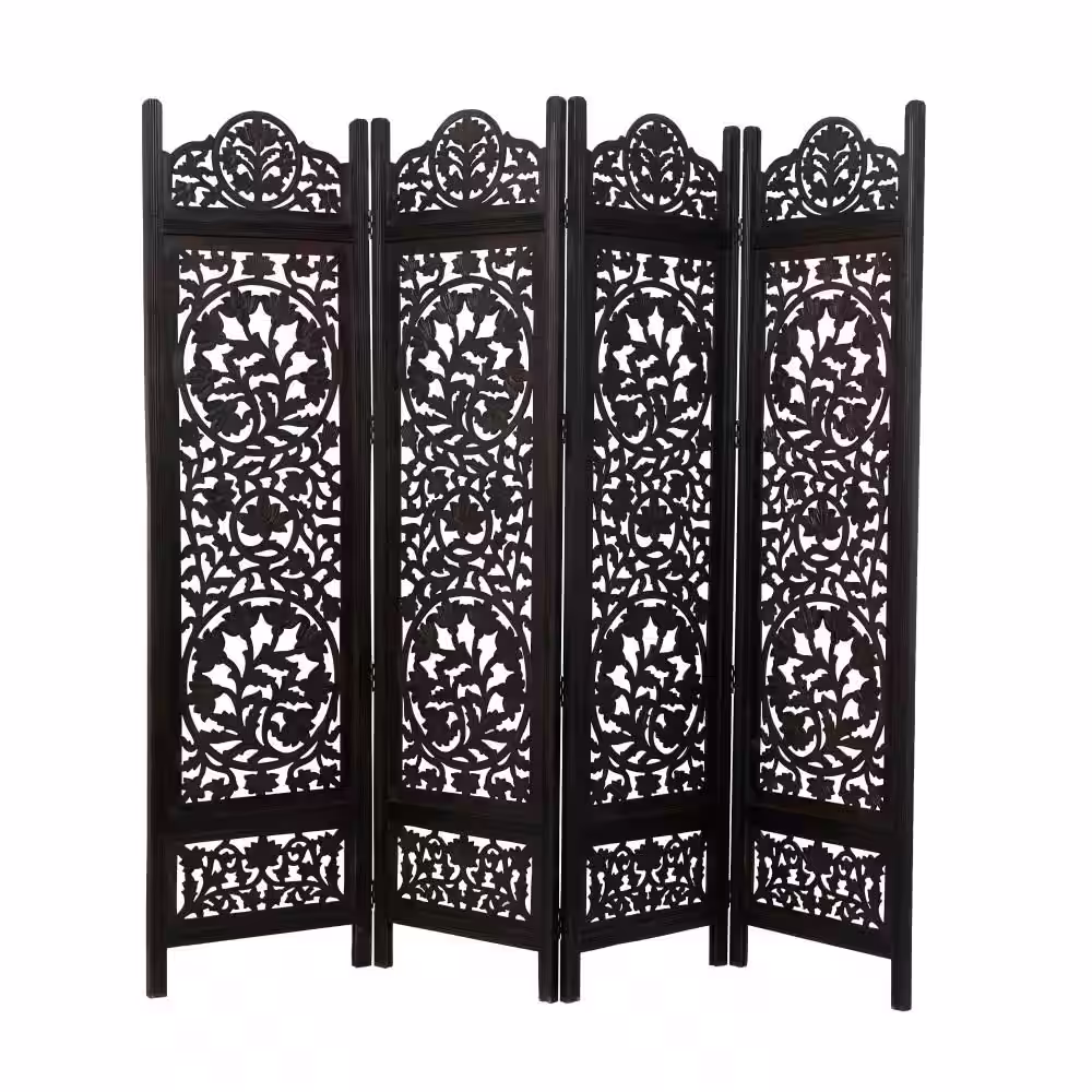 Litton Lane 6 ft. Black 4 Panel Floral Handmade Hinged Foldable Partition Room Divider Screen with Intricately Carved Designs