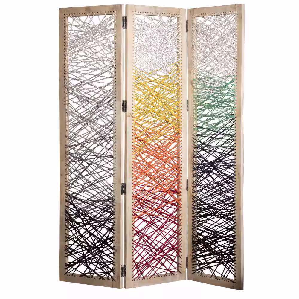 Benjara Multicolor 3-Panel Wooden Screen with Woven Reinforced Yarn