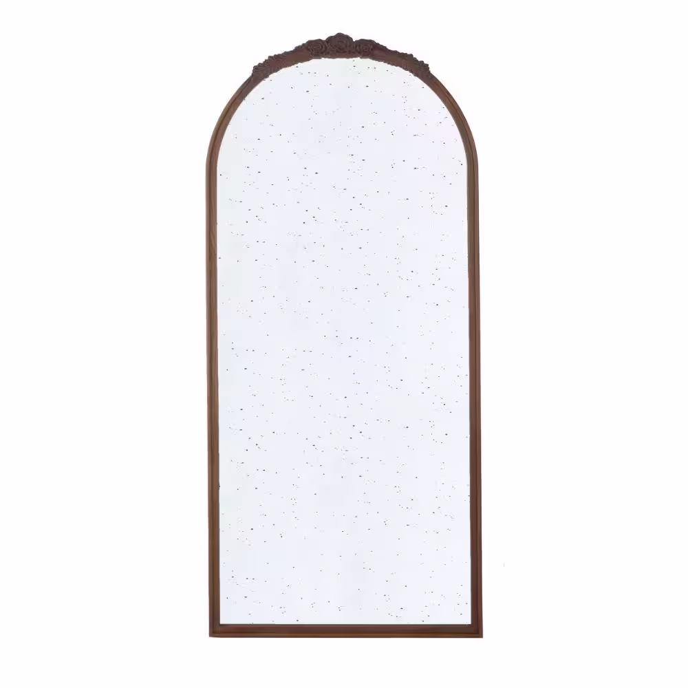 Benjara 2 in. W x 65.2 in. H Brown Arched Wood Frame Wall Mirror with Hand Carved Rose