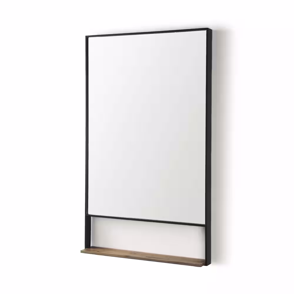 Mercana Cora 24 in. W x 40 in. H Black Metal Rectangular Wall Mirror with Brown Wooden Shelf
