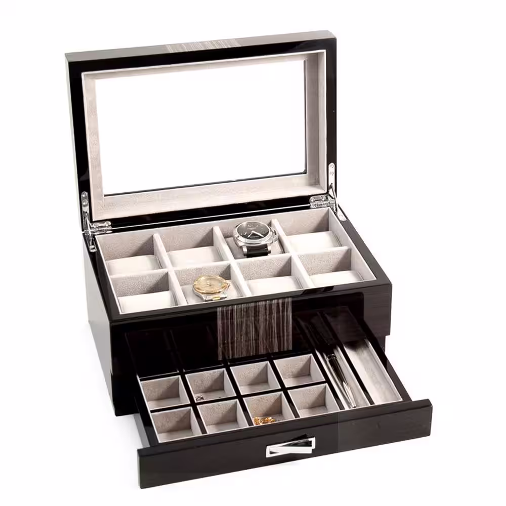 BEY-BERK Lacquered Wenge Wood 8-Watch Box with Glass Top Drawer for Cufflinks and Pens