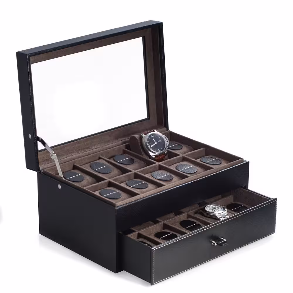 BEY-BERK Black Pebbled Leather 20 Watch Case with Glass See-Thru Top and Drawer