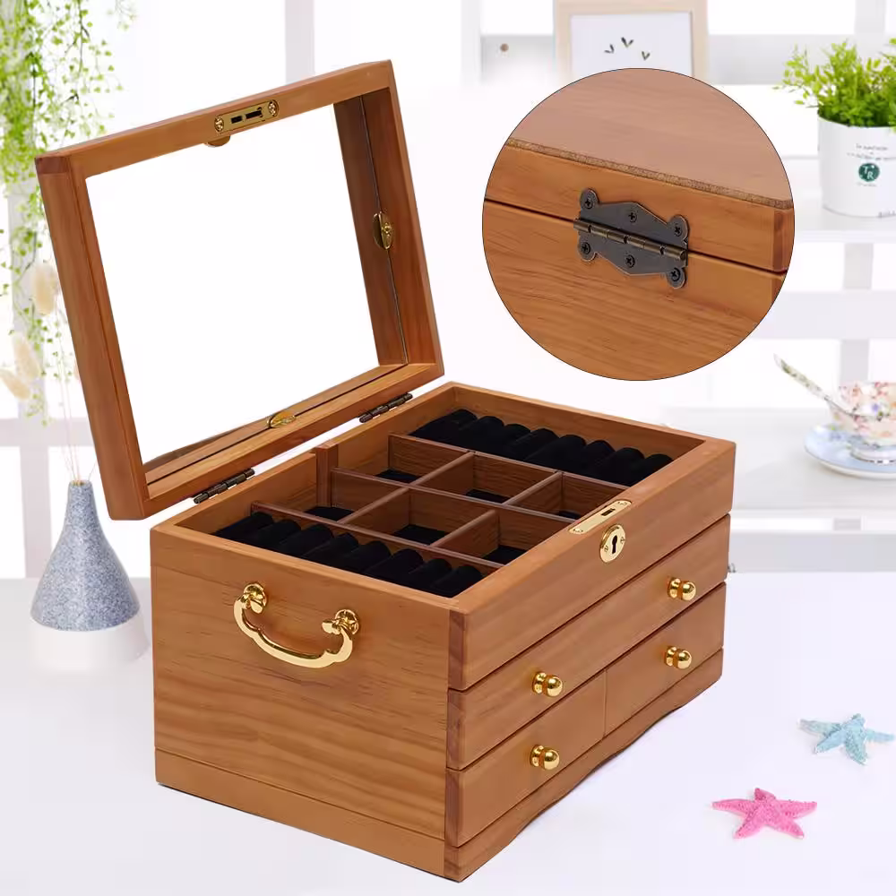 YIYIBYUS 3 Layers Retro Wooden Jewelry Box with Mirror and Lock