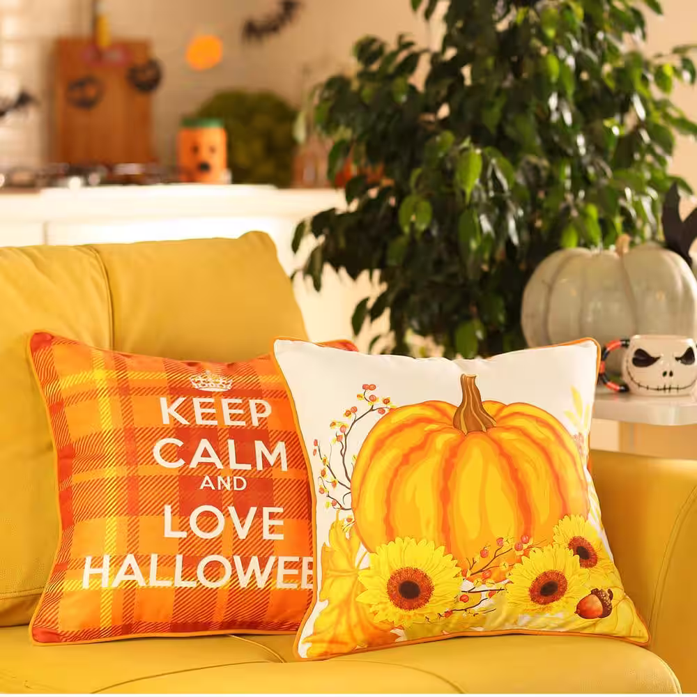 None Fall Season Decorative Throw Pillow Halloween Quote Plaid and Pumpkin 18 in. x 18 in. Orange Square for Couch (Set of 2)